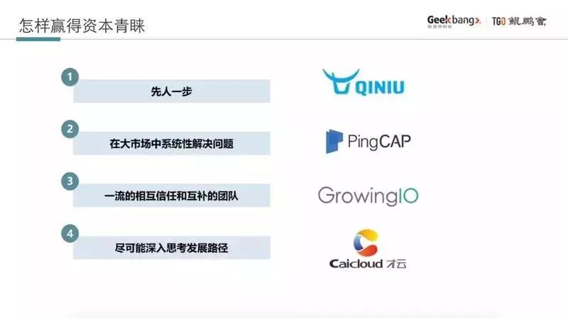 现在很多公司的购买决策慢慢从领导变成了技术人员。要提升你的产品口碑,可以出去多做一些 meetup,做一些用户分享会,与参会技术者聊聊技术。也许多做几次,效果就出来了。在 5 年前,我刚开始做底层技术投资的时候,这个现象是没有发生的,而现在这样的趋势已经变成越来越明显。
