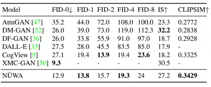 可以看到,NÜWA以12.9的FID-0和0.3429的CLIPSIM成绩,明显地优于CogView。