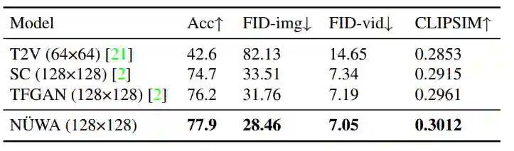 为了进行公平的比较,所有的模型都使用64×64的分辨率。尽管只给了一帧作为条件(Cond.),NÜWA仍将FVD的SOTA得分从94±2推至86.9。