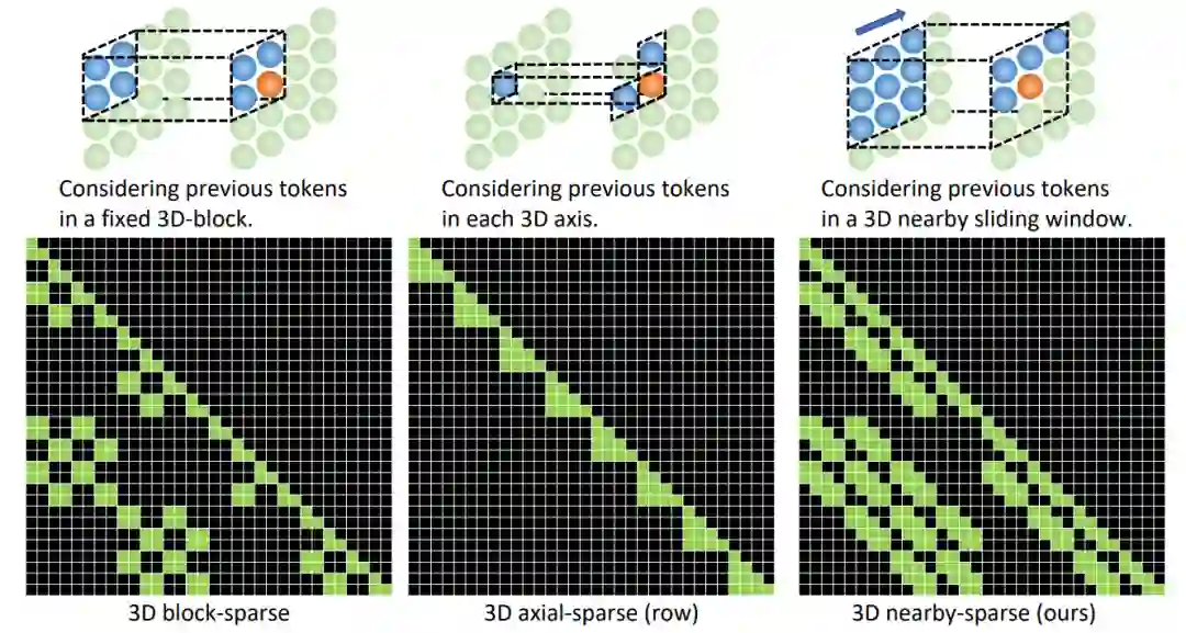 还提出了一个通用的3D encoder-decoder框架,能够同时覆盖文本、图像和视频。能同时考虑空间和时序维度的3D nearby-sparse attention机制。
