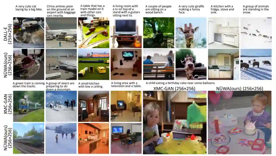 尽管XMC-GAN的FID分数为9.3,但与XMC-GAN的论文中完全相同的样本相比,NÜWA生成的图像更加真实。特别是在右下角的那个例子中,男孩的脸更清晰,气球也是正确的。