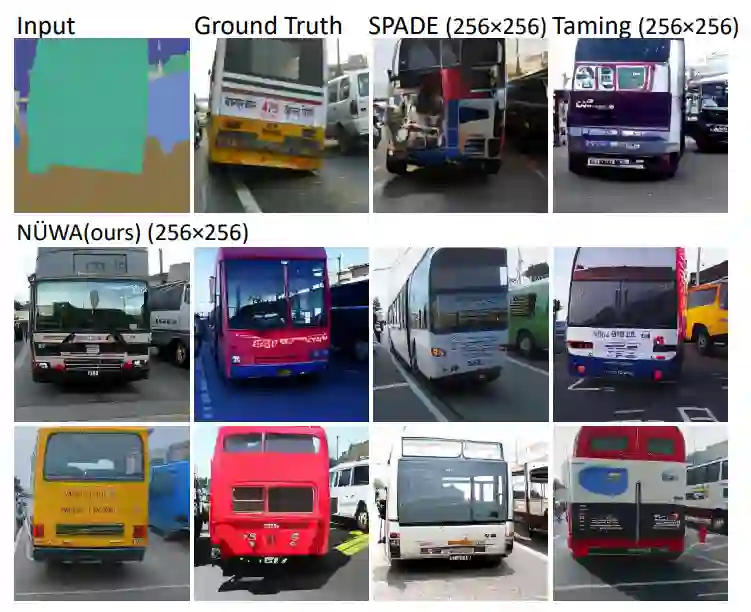 通过定性比较在MSCOCO上的表现可以看到,与Taming-Transformers和SPADE相比,NÜWA生成的图像种类更多,有的甚至连窗户上的反射也清晰可见。