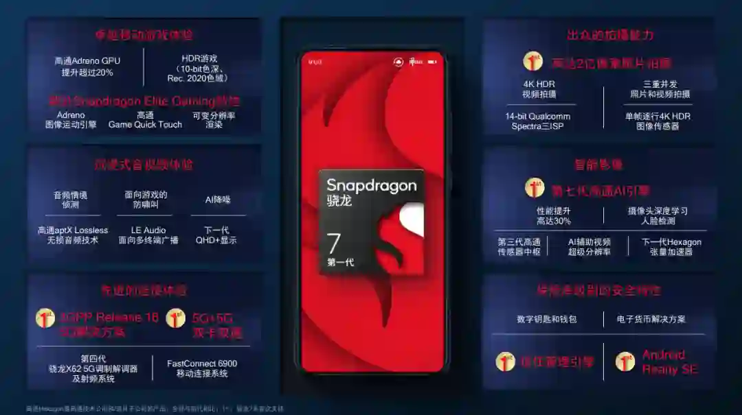 除了骁龙 8+,骁龙之夜还发布了第一代骁龙 7 移动平台,虽然是称为“第一代”,但是其承载的很多特性,我们已经见过,并不陌生,它继承了骁龙 8 一系列的“旗舰基因”,集多个“首次”于一身。