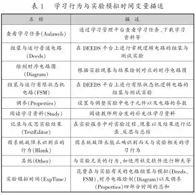 原始数据集定义并记录了不同学时和不同学习任务下的15种大类的学习活动。例如,“Deeds_Es_#_#”表示某一课时进行某一任务的普通逻辑电路模拟活动;“Deeds_Es”表示未具体甄别出所属课时以及所属任务的普通逻辑电路模拟活动。需要说明的是,“Deeds_Es_#_#”和“Deeds_Es”虽然在数据采集中被认为是两种学习活动,但它们之间的差异仅在于具体课时和任务的不同,本质上都是在进行逻辑电路模拟活动。因此,本研究对类似的学习活动进行了合并处理,将其归纳为>种学习行为。另外,为了探究学习者之间在实验模拟时间(不包括在实践操作之外的学习任务查看、学习任务提交等活动投入时间)上的差异,将学习者在虚拟仿真实验平台上的学习时间也纳入考虑。最终,本研究选择了如表1所示的10个变量,并在表中对各变量进行了描述与说明。