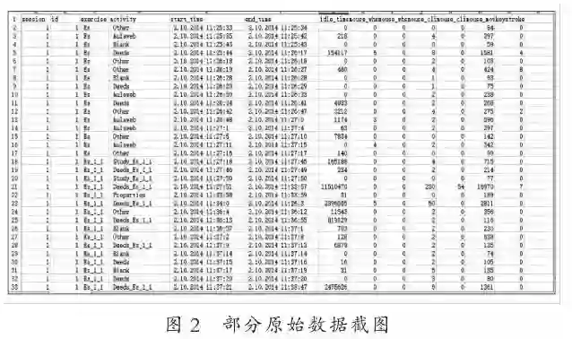 学习者在DEEDS平台上的学习过程数据,经收集起来形成了研究所使用的数据集。图2展示了部分数据,数据集中包含13个字段,涵盖学习者基本信息(id字段,学号)、课时与练习基本信息(session字段,当前学习课时;exercise字段,当前练习名称)以及活动相关信息(activity字段,活动名称;start_time字段,活动开始时间等)。由于部分学生在学习过程中记录的缺乏,导致其学习过程数据不完整。因此,本研究选取具有完整记录的>2名学生在课程学习所产生的20余万条学习过程数据进行分析,重点分析数据集中记录活动(activity)字段,考察学生在虚拟仿真实验课程中学习行为模式上的差异,并进一步探究学习行为模式与学习效果之间的关联。
