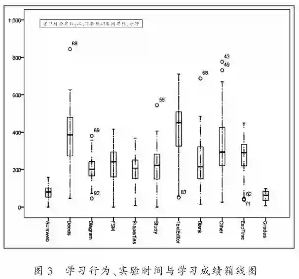 班级学生学习行为、实验模拟时间以及学习成绩分布的箱线图,如图3所示。