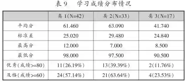 为进一步分析不同学习模式群体在学习效果上的差异,本研究对群体学习成绩进行了两两比较,结果(见表8)显示,类3与类1、类2均存在着显著差异,类1与类2在学习效果上不存在显著差异。各类学习成绩分布情况如表9所示,其中优秀行表征各类群体中成绩在80分以及上的人数;及格行表征考试成绩在60分及以上的人数。虽然类1与类2学习成绩虽在总体水平上不存在显著差异,但是类2代表的学习行为模式群体的学习成绩优秀率和及格率明显高于类1(见表9),这表明在课程学习中,类2代表的学习行为模式更为可取。