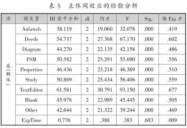 =67.7%)这两种行为。在实验模拟时间(ExpTime)上,类间不存在显著差异。进一步对群体在各变量上进行两两比较,结果发现:9种学习行为在三类学习群体间均存在显著差异