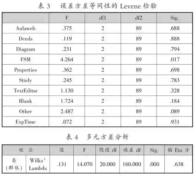然后,进一步使用多元方差分析方法(也称多变量方差分析),探究群体在各行为变量上的差异。群体间在各变量差异上探索的过程,实质上就是将各行为变量看作因变量,分组结果作为自变量。多元方差分析可以同时研究多个因变量之间是否存在显著性差异,避免了单因变量方差分析检验效率低、忽略变量间相关关系等缺点[26],该方法已在教育研究中得到了有效应用[27-28]。
