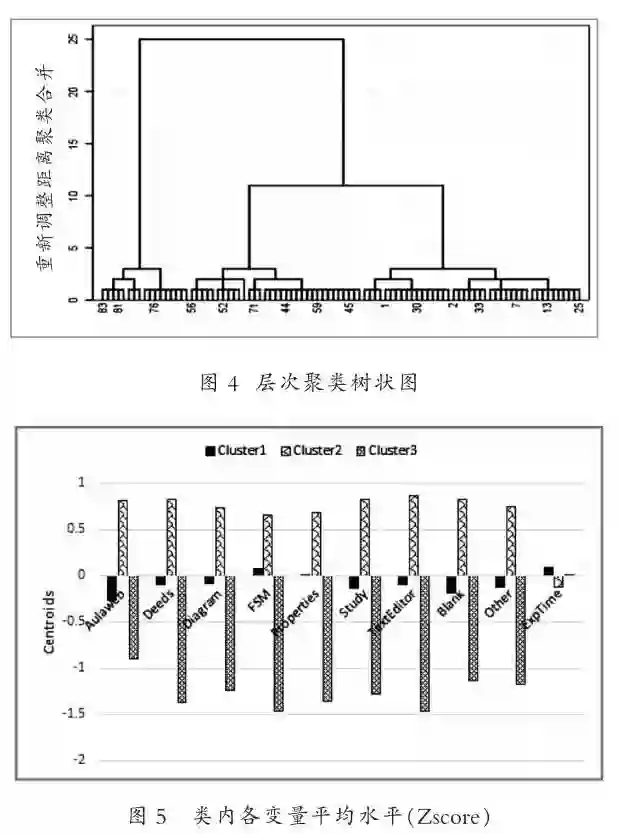 其次,由于我们无法事先得知簇的个数,因此采用层次聚类方法进行群体划分。层次聚类是指聚类过程按照一定层次进行,按照聚类的方式可分为凝聚方式聚类和分解方式聚类。本研究采用凝聚方式进行聚类,即首先每个个体自成一类,然后按照某种方法度量所有个体间的相似度,并将当前最亲密的个体或小类再聚成一类,接下来再次度量剩余个体和小类间的相似度,并将当前最近的个体或小类再聚成一类,重复上述过程,不断将所有个体或小类聚集成越来越大的类,直到所有个体聚到一起,形成一个大类为止[25]。另外,本研究在度量个体间亲疏程度上,采用鲁棒性较好的离差平方和法(Ward Method)进行个体间相似度计算,采用欧式距离进行个体间距离的计算。