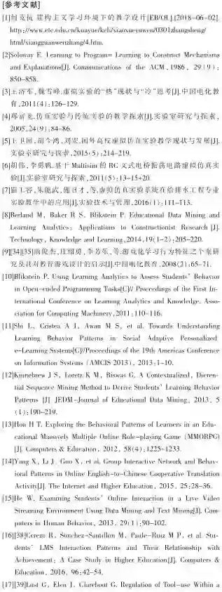 近年来,大量数字化虚拟仿真实验平台的涌现,为学习者的建构过程测评提供了可能。虚拟仿真是指借助于多媒体、仿真和虚拟现实等技术,使用计算机对传统实验各操作环节进行模拟和仿真[3]。由于该方式具有缓解经费紧张、利于实验教学和设施利用、利于学生创新能力培养等多方面的优势[4],在学科教学中得到了越来越广泛的应用[5-7]。与此同时,随着信息技术、数据存储技术的发展,学习者在虚拟仿真实验平台下的实验操作过程数据,也很容易被收集起来。基于数据挖掘及学习分析技术,教师借助学生的学习过程数据,对学生的学习习惯、学习方式进行挖掘,可关注到每位个体在学习中的问题,使得提供更具针对性的学习支持服务成为可能。学习分析和教育数据挖掘,是当前学习科学领域的研究热点。当前大部分的学习分析和教育数据挖掘,聚焦于在线理论知识学习和认知课程,这些学习任务高度结构化且测评具有明确的答案。然而,对于很多实践操作类学习任务,由于建构过程的复杂性,反馈和评价非常困难,相关的研究也较为缺乏[8]