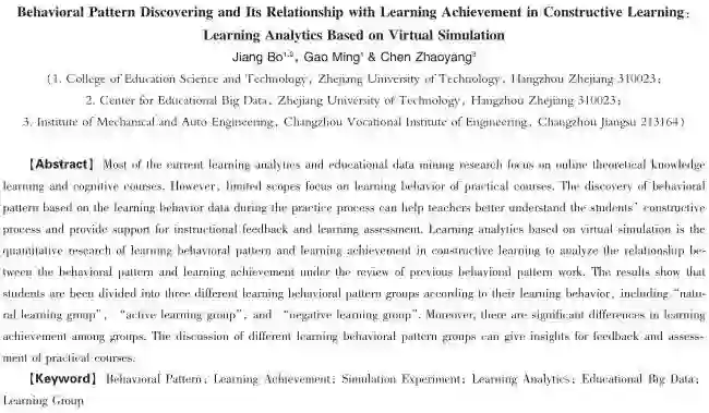 当前的学习分析和教育数据挖掘研究,大多聚焦于在线理论知识学习和认知课程,而缺乏对实践操作类课程学习行为的分析。从实践操作过程中的学习行为数据出发进行的行为模式,可帮助教师更好地理解学习者的建构过程,为课程教学反馈和学习评价提供支持。基于虚拟仿真课堂的学习分析是在已有行为模式发现研究并进行梳理的基础上,对建构学习环境下的学习行为模式和学习效果开展的量化研究,可以进一步分析行为模式与学习效果之间的关系。研究发现,根据学习者的学习行为,可以划分出“顺其自然学习群体”、“积极学习群体”以及“消极学习群体”等三类不同的学习行为模式群体,且不同群体在最终学习效果上存在着显著差异。对不同学习行为模式群体进行的讨论,可以为实践操作类课程的反馈和评价提供参考借鉴。