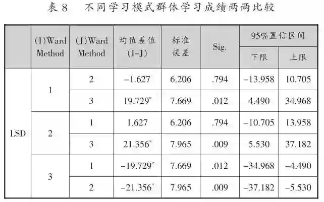),表明不同学习模式群体在学习成绩上存在显著差异(如表7所示)。