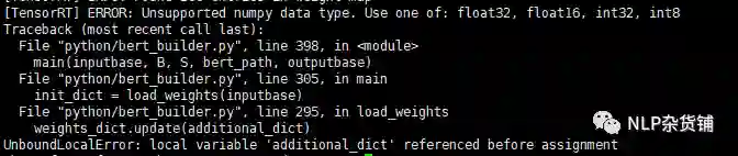 报错表示,在模型数据加载过程中,出现了不支持的数据类型,于是在bert_builder.py的252/253行加入了代码: