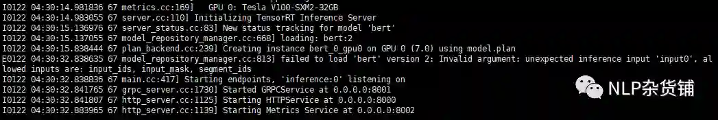 NV_GPU=1 nvidia-docker run --rm --shm-size=1g --ulimit memlock=-1 --ulimit stack=67108864 -p50014:8000 -p50015:8001 -p50016:8002 -v /自己的路径/models:/models nvcr.io/nvidia/tensorrtserver:19.08-py3 trtserver --model-repository=/models