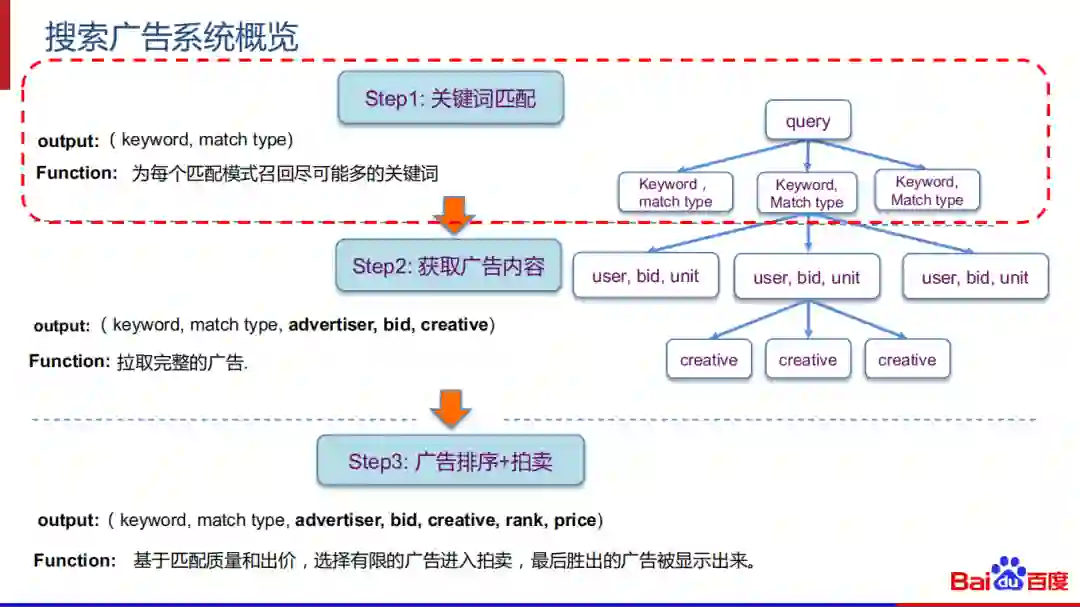 第二步是在关键词匹配成功后获取广告内容,确定广告对应的广告主、出价和广告创意。