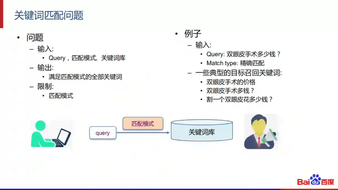 本次分享的重点是“关键词匹配问题”,抽象来说,这个问题的输入是query、匹配模式、关键词库,输出是满足匹配模式的全部关键词,限制是匹配模式。例如输入是“双眼皮手术多少钱”,在精确匹配模式下,产生的典型目标召回关键词是“双眼皮手术的价格”、“双眼皮手术多少钱”、“割一个双眼皮花多少钱”等。