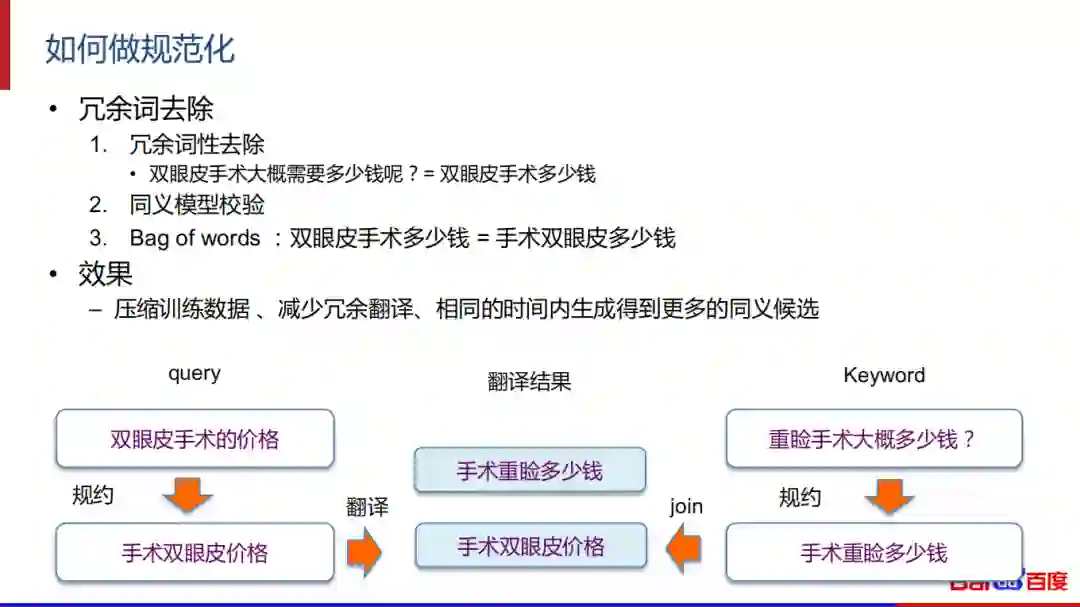 具体进行规范化的步骤是,基于冗余词性的去除。例如副词、标点符号的处理;还可以采用同义模型来进行校验;更进一步的是做bag of words的处理。其效果是可以极大的压缩训练数据、减少冗余翻译、相同的时间内生成更多的同义候选。