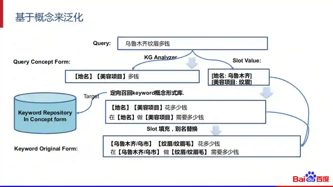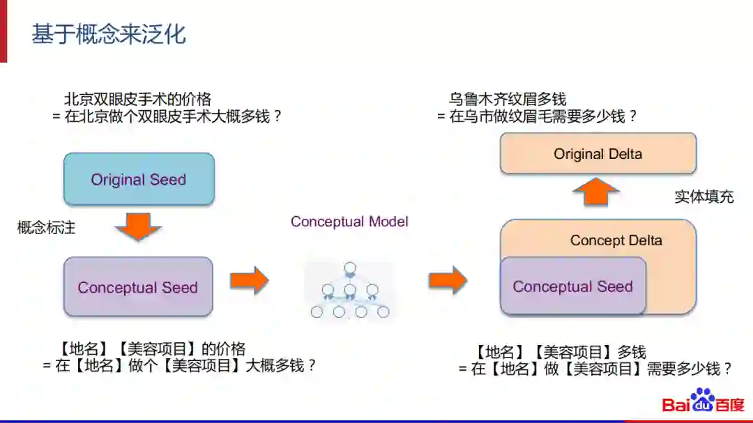 我们首先把原始的数据先转换到概念空间中去,然后在概念空间中做泛化,然后对泛化后的概念模板填充实体,得到最后的召回结果。