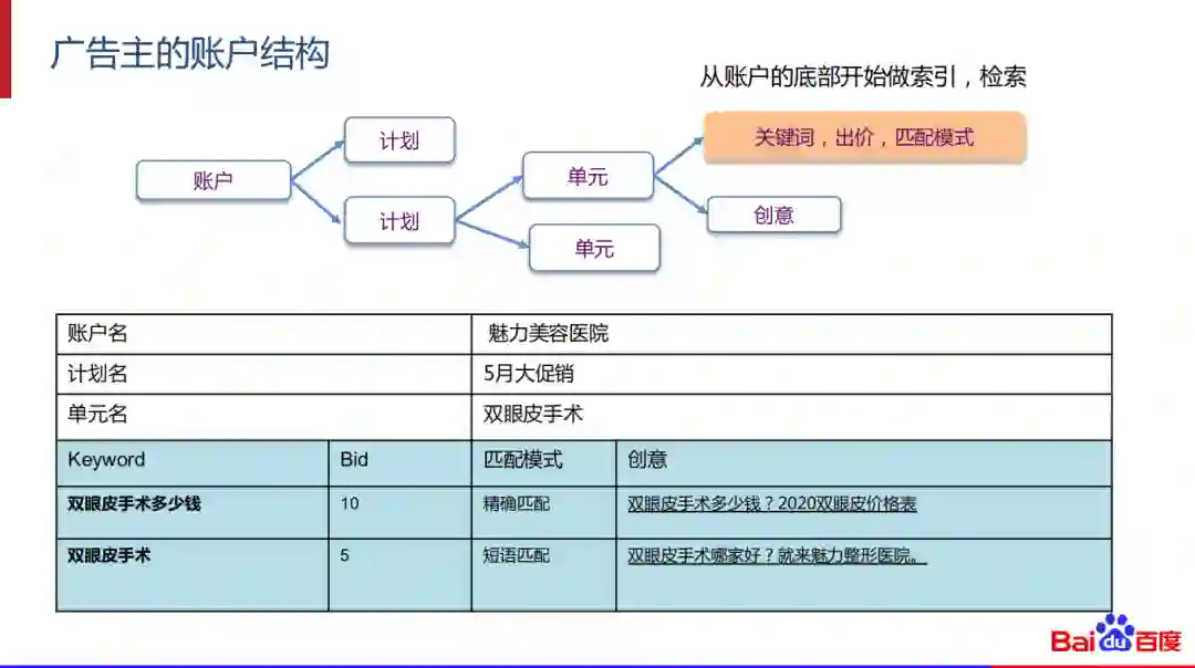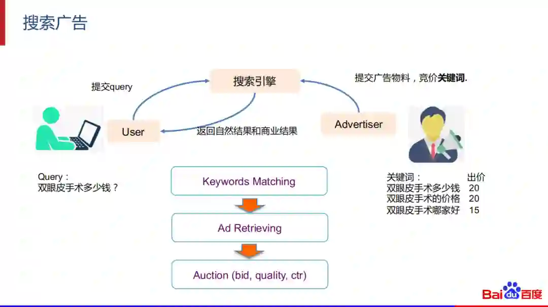 广告主侧会向引擎提供物料,同时竞价关键词。比如一个做双眼皮的美容机构,会买例如“双眼皮手术多少钱”、“双眼皮手术的价格”、“双眼皮手术哪家好”等关键词。这些关键词会被提交到搜索引擎。需要指出的是,这里说的关键词不是我们通常所说的关键词,而是指广告主购买的query。