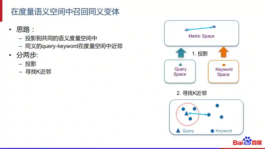 还有一种方式是基于语义度量模型来进行同义泛化,大致的意思就是把翻译模型换成语义向量模型,检索过程是在语义向量空间中寻找K近邻。