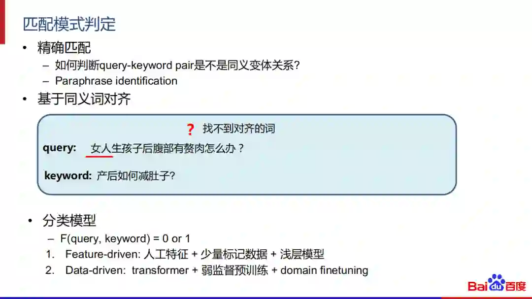 匹配模式的判定:是搜索引擎广告面临的独特问题,用来判定是精确、短语还是智能匹配。这是产品的根基,由产品对广告主的契约保障。
