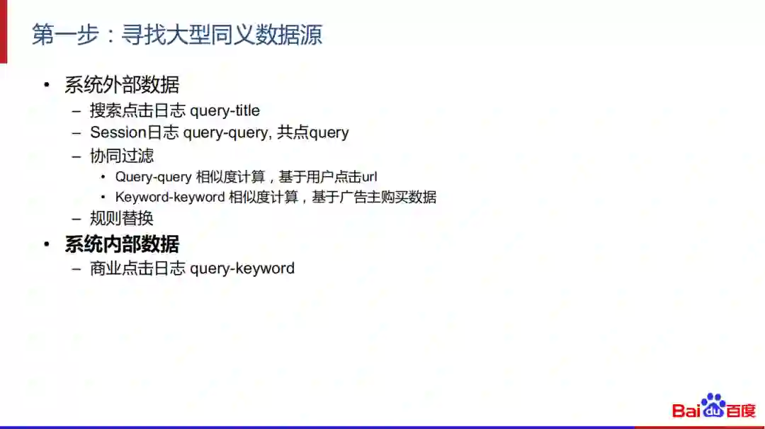 在如何选择大型同义数据源方面,一方面可以利用系统外部数据,例如搜索点击日志、Session日志、协同过滤和规则替换。另一方面可以使用系统内部数据,例如商业点击日志。