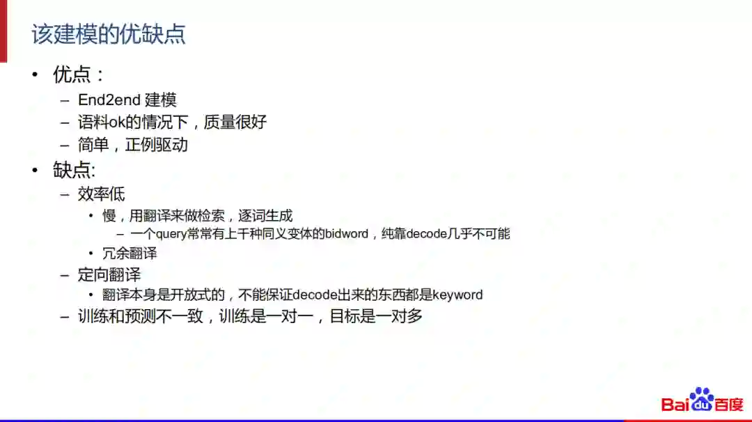 效率比较低,因为是用翻译的方式来做检索的工作,逐词生成。一个query通常有上千种同义变体的关键词,纯靠decode几乎不可能完成。同时如果数据不作清洗的话,冗余度会非常高。