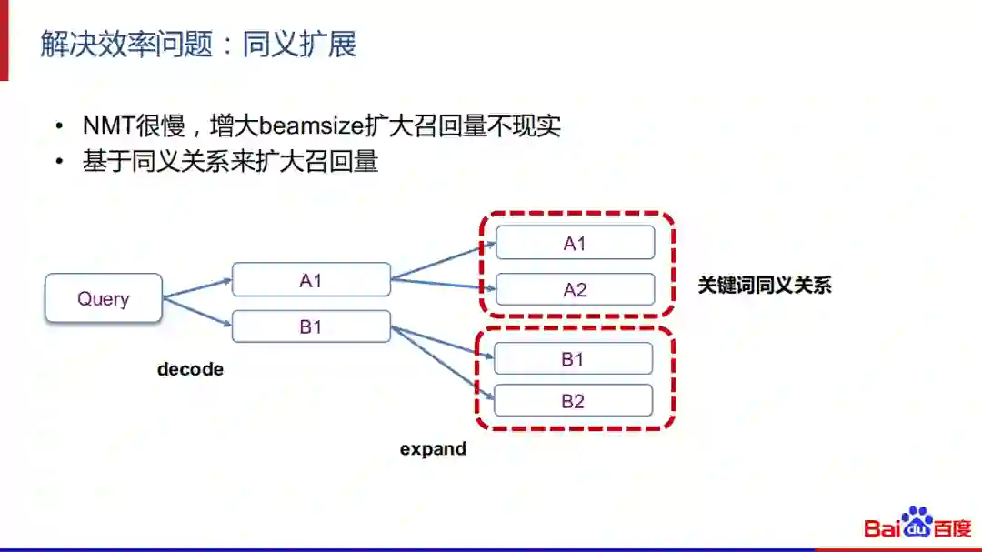 还需要解决的一个问题是同义扩展,因为NMT很慢,增大beamsize来扩大召回量是不现实的。可以采用基于同义关系来扩大召回量。