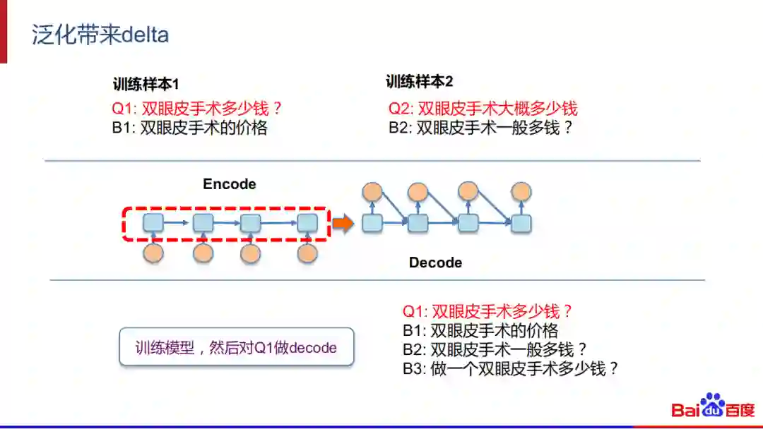 在上图中,训练样本1的Q1是“双眼皮手术多少钱?”,B1是“双眼皮手术的价格”。训练样本2的Q2是“双眼皮手术大概多少钱”,B2是“双眼皮手术一般多钱?”。使用S2S模型来对样本进行训练,然后对Q1做Decode,由于Q1、B1是在训练样本1中,所以首先能够得出B1,同时由于Q1和Q2相似度比较高,所以也能够获取结果B2,如果模型的泛化能力足够强的话,说不定能得出B3。