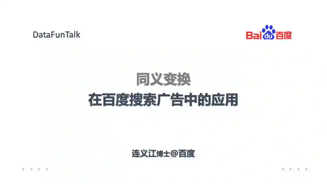 最后总结一下,本次分享的主要内容是关键词匹配的大背景、同义变换的应用场景(包括同义匹配、keyword队列压缩、Query规范化和改写)和如何做同义变换(包括规范化和知识推理),最后讲的是如何做基于ERNIE和对抗训练来做同义判别。