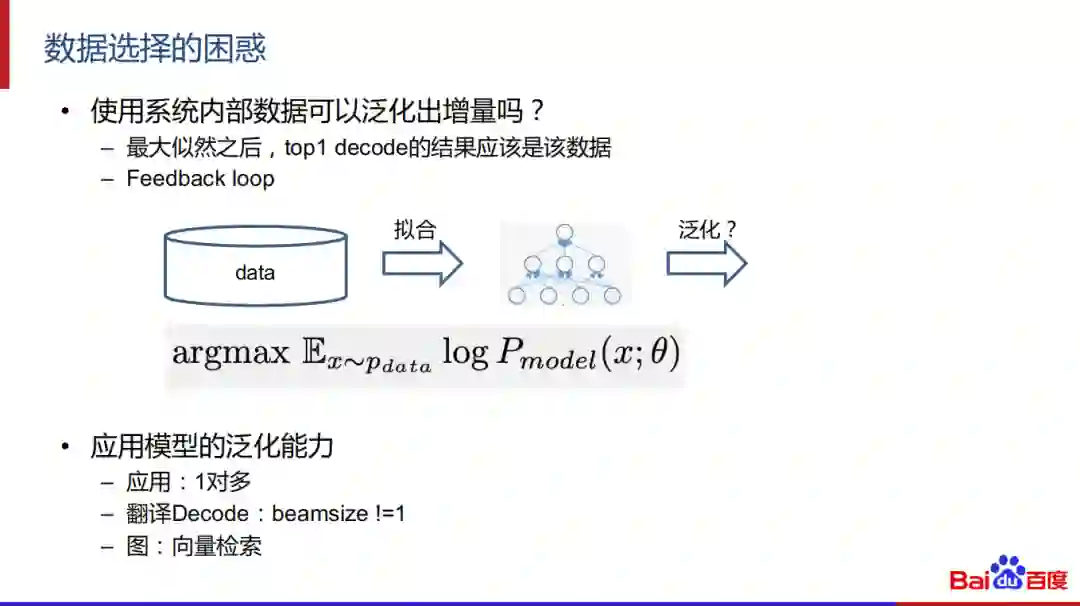 在数据选择方面会产生一些困惑,使用系统内部数据可以泛化出增量吗?因为使用最大似然的方式求解就是使用模型来拟合数据,例如使用翻译模型或者图模型,top1 decode的结果就是该数据,这个过程好像无法产生增量数据,会陷入feedback loop中。事实上可以使用系统内部数据也可以泛化出增量,因为我们实际应用中是做1对多的decode,在图模型中我们会近邻检索出不止一个候选。下面举例来说明泛化带来的delta。