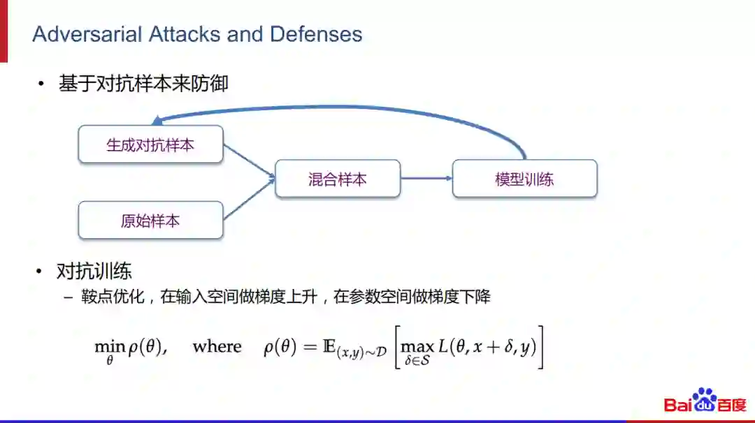一种提升鲁棒性的方法是基于对抗的样本来做防御,通常GAN是为了提升生成模型的精准度,其实GAN也可以判别模型的效果提升,我们可以在原始样本的基础上,生成一些对抗样本,最后混合起来作为模型的输入,以此来提升模型。对抗训练是鞍点优化,在输入空间做梯度上升,在参数空间做梯度下降。