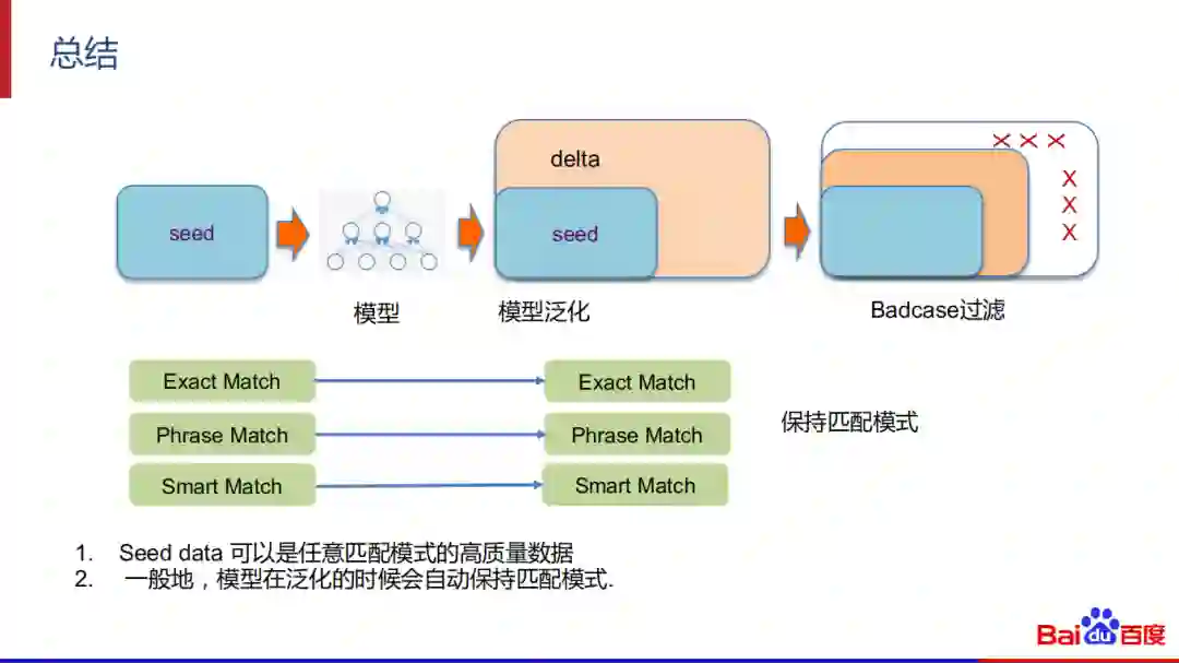 简单总结而言,基于数据驱动的方式做同义变换一般是基于种子数据抽象出一个模型,通过模型来进行泛化得到delta数据。在这里,数据是源,模型是媒介,什么样的数据就会有什么样的泛化结果。这种简单的delta泛化方法在实际中可以很好的保持匹配模式。如果你的数据是Phrase match的,那么泛化出来的一般也是phrase match的。但是在此过程中,因为输入数据的准确性和模型自身的问题, delta泛化不可能是百分百准确的,中间很有可能产生bad case。