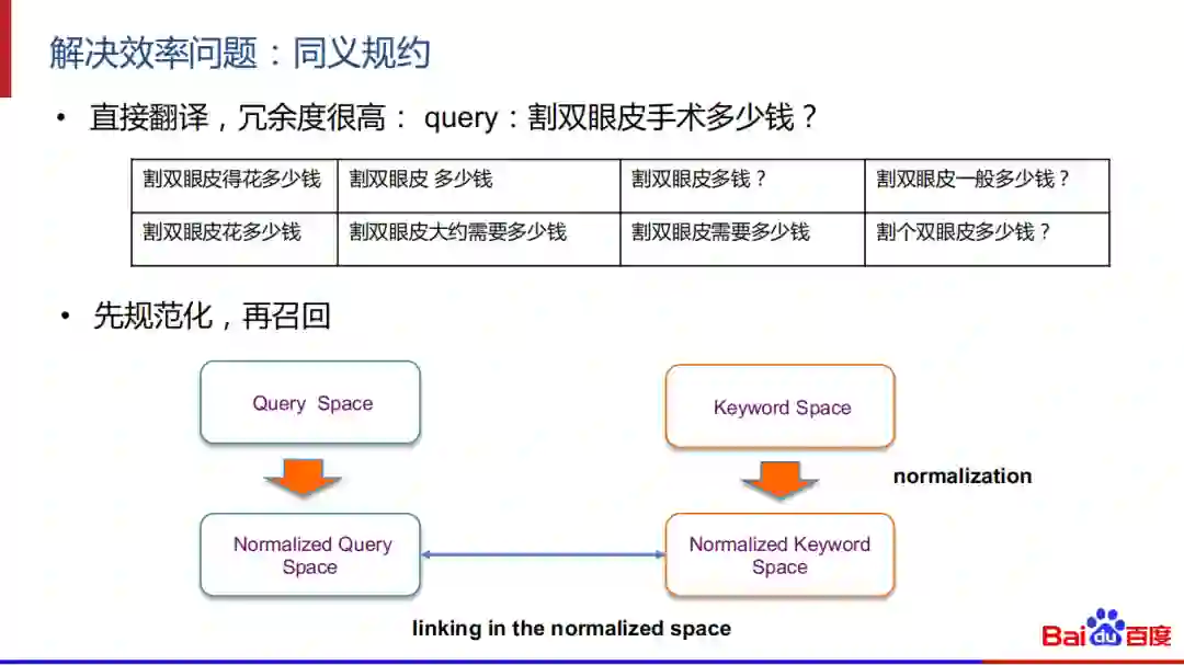 解决效率问题,可以使用同义规约的方式来解决,直接翻译的话,冗余度是很高,如果query是“割双眼皮手术多少钱”,类似的query有很多,例如多一些空格,少一些空格,多一个标点符号,多些副词,感叹词等。所以我们可以对Query和Keyword空间,先都进行归一化, 然后在规范化的空间中来做匹配。