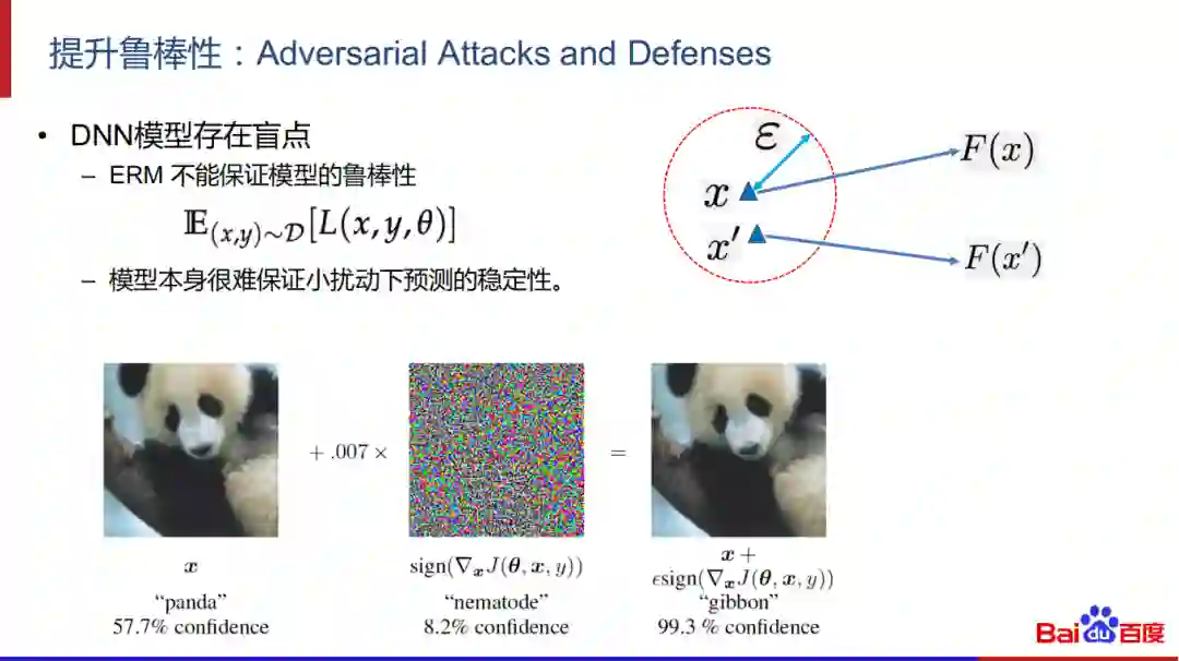 另外一方面,我们迫切需要提升模型的鲁棒性,传统的模型都是基于经验风险最小化来训练,这本身保证不了模型的鲁棒性,比如模型在小扰动下预测的稳定性。例如下面的例子,在图像分类的模型,对熊猫x进行预测的效果很好,在输入端加入一些微弱的的白噪音扰动之后,人可以识别出来,但是模型很快就把它识别成了其他动物。