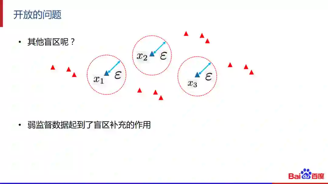 但是事情还没有结束,在攻击对抗训练之后,只能保证样本x1、x2和x3的邻近空间有鲁棒连续的结果。那么剩余的其他空间呢?我们知道query叉乘keyword是一个非常巨大的空间,在这么大的空间上的其他盲区怎么办?这个是一个开放型的问题。之前我们使用的海量的弱监督数据其实是起到了这里的盲区补充的作用。