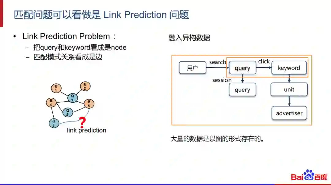 基于图模型来做同义泛化也是一个很好的方案,可以把匹配问题看作link prediction问题,把query和keyword看成node,匹配模式关系看成边。用图来求解匹配问题,我们可以引入更多的数据,因为平时我们使用最多的都是一些简单的线性数据,如用户点击数据,其实更为海量的数据是以图的形式存在的,如用户的seesion日志和广告的购买账户层级数据等等,这样融合在一起形成一个很大的图,我们可以把数据都融入到网中进行训练。