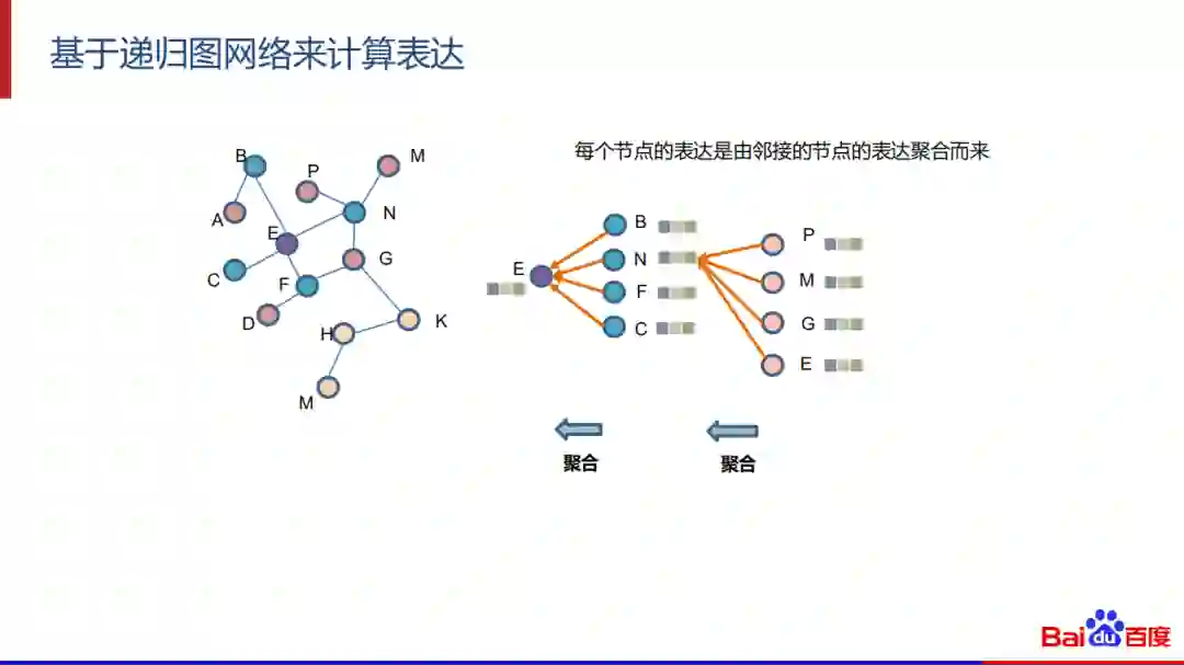 图网络可以选择的方案有很多,比如我们可以选择基于递归图网络来计算表达。在递归图网络中,每一个节点的向量都是由其邻接的节点的表达聚合而来,这样表达的好处是节点之间多跳的邻接关系,还有一对多的关系可以同时考虑到建模道中来。比如对E节点而言,可以通过节点B、N、F、C 聚合向量来表达,同样的,递归下来,每个邻居也可以这么做。比如节点N可以通过节点P、M、G、E来表达。两次传播之后,二跳的信息G就传到了E的节点表达中去了。