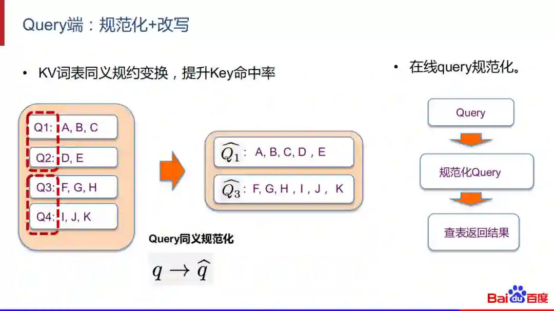在query端,我们可以进行规范化和改写。一般的搜索广告都会针对高频query做离线的充分计算放到一个高频词表。当query来了之后,先去查表来看是否有结果命中。我们可以针对高频KV词表中的key做同义规约变换,从而提升key的命中率。KV词表中,K就是关键词,V就是触发的结果。例如Q1原来的触发结果是A、B、C;Q2的触发结果是D和E,在同义规约后,Q1和Q2的触发结果是A,B,C,D,E。相对于原来Q1只命中A,B,C而言,规约之后提升了命中率,同时整个词表只需存储规约Q1和Q3来减少key的量级。