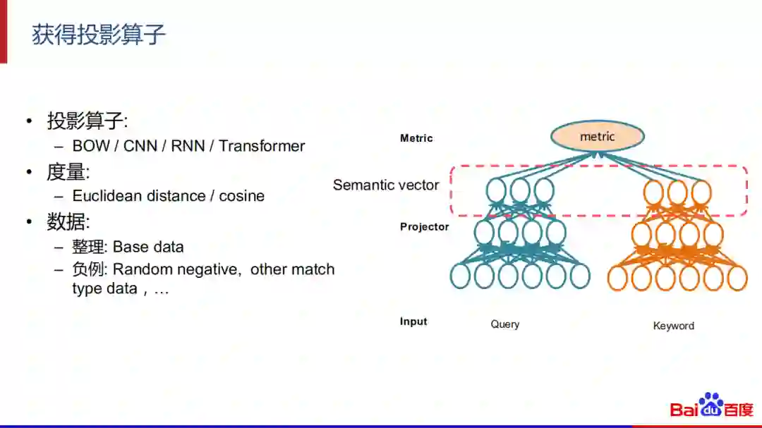 投影算子有很多,例如BOW、CNN、RNN或者Transformer;度量口径可以考虑欧式距离或者余弦相似;在数据方面,因为最后我们会在整个全量空间中做语义检索,和之前的翻译模型不同,我们需要同时考虑正例和负例,并且要精心的去设置负例。