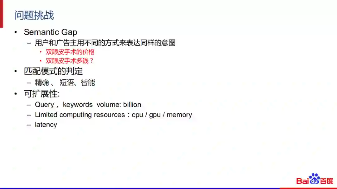 Semantic Gap:用户和广告主用不同的方式来表达同样的意图。例如“双眼皮手术的价格”和“双眼皮手术多钱?”是同一个意思,但是他们会用不同的字面来表达。这也是NLP中一个基础又很重要的问题。