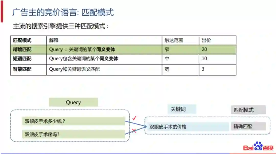 举一个例子,如果广告主购买的关键词是“双眼皮手术的价格”,并且指定其匹配模式是精确匹配的话,当query是“双眼皮手术多少钱?”时,广告主的关键词会被匹配到,而“双眼皮手术疼吗”则不会被匹配到。