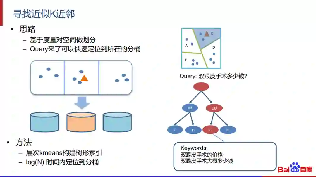 在投影模型训练出来之后,进行K近邻的查找。首先是基于度量对空间做划分,在query来了之后,可以快速定位到所在分桶。在此过程中可以用层次kmeans构建树形索引,然后query来了可以在log(N)时间内定位到分桶。