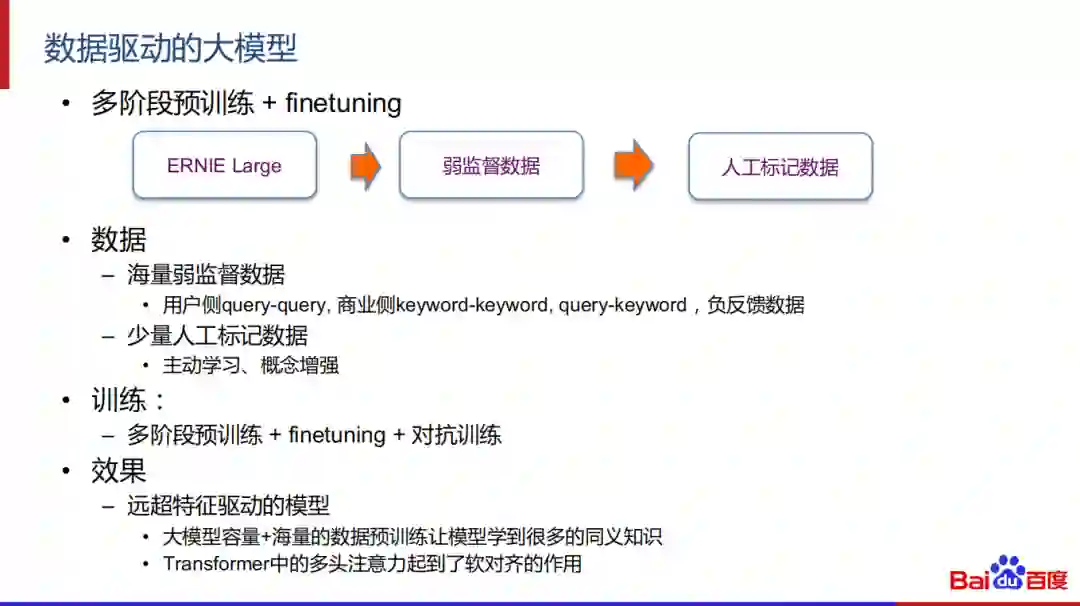 在数据驱动的大模型中,包括多阶段预训练finetuing,在百度使用的是ERNIE Large+弱监督数据+人工标记数据的多阶段预训练加finetuning的方式。