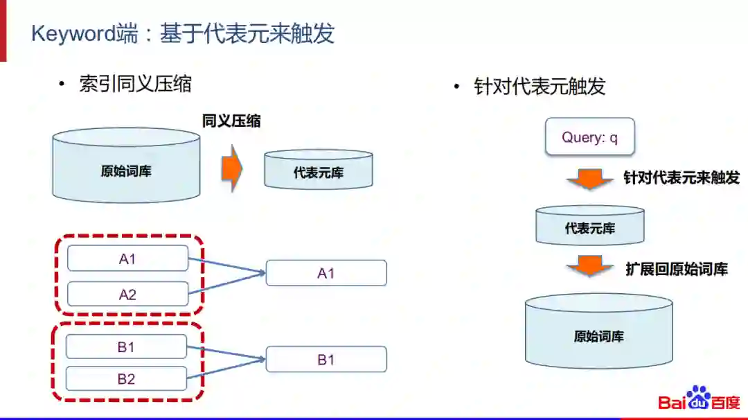 更为激进一点,我们可以用基于代表元来触发。通过对原始词库进行同义压缩,例如对A1,A2和B1,B2进行同义压缩成A1和B1,可以降低keyword端的量,只需针对A1和B1进行触发。在线上使用中,我们采用基于代表元来触发,然后再扩展回原始词库。