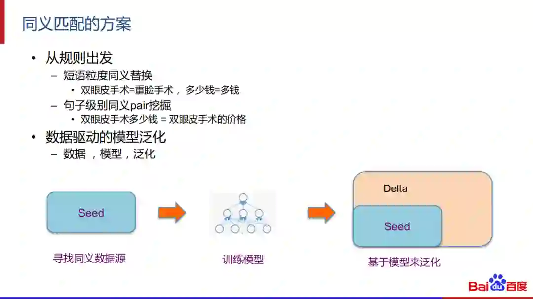 在同义匹配中,以精确匹配场景为例,首先可以从规则出发,进行短语粒度的同义替 ( 例如双眼皮=重睑手术,多少钱=多钱 ) 或者进行句子级别的pair挖掘。今天分享的主要内容是通过数据驱动的模型来提高泛化。主要为三步走:寻找同义数据源、训练模型并基于模型来泛化。