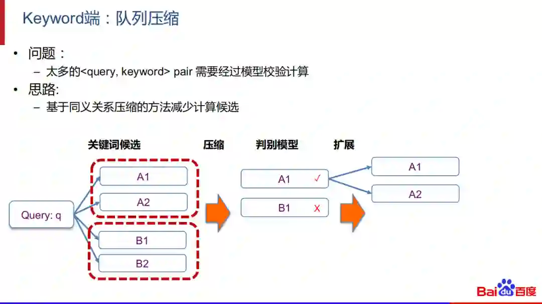 另外一个应用场景是在Keyword端,在关键词匹配中,给定一个query,我们通常会触发得到大量的候选关键词,这些候选为了保证质量,都需要经过模型校验计算来确认。我们的思路是基于同义关系压缩的方法减少计算候选。在上图的例子中,一个query触发4个关键词候选,通过离线计算A1和A2是同义,B1和B2是同义,那么线上只需要校验A1和B2,当A1通过校验后再扩展回去。这样可以极大地减少判别模型的计算压力。