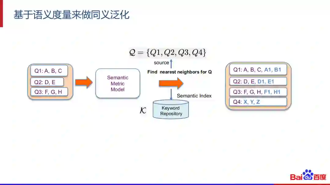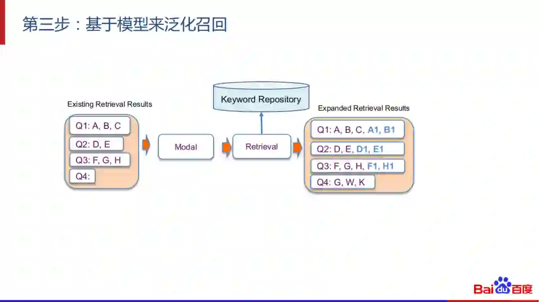 最后是基于模型来泛化召回,使用模型的自反馈来进行泛化,以前Q1有3个召回的结果A,B,C。基于模型,定向在关键词库中做召回,有可能把A1和B1也召回出来。图中的蓝色标记都是泛化出来的结果。