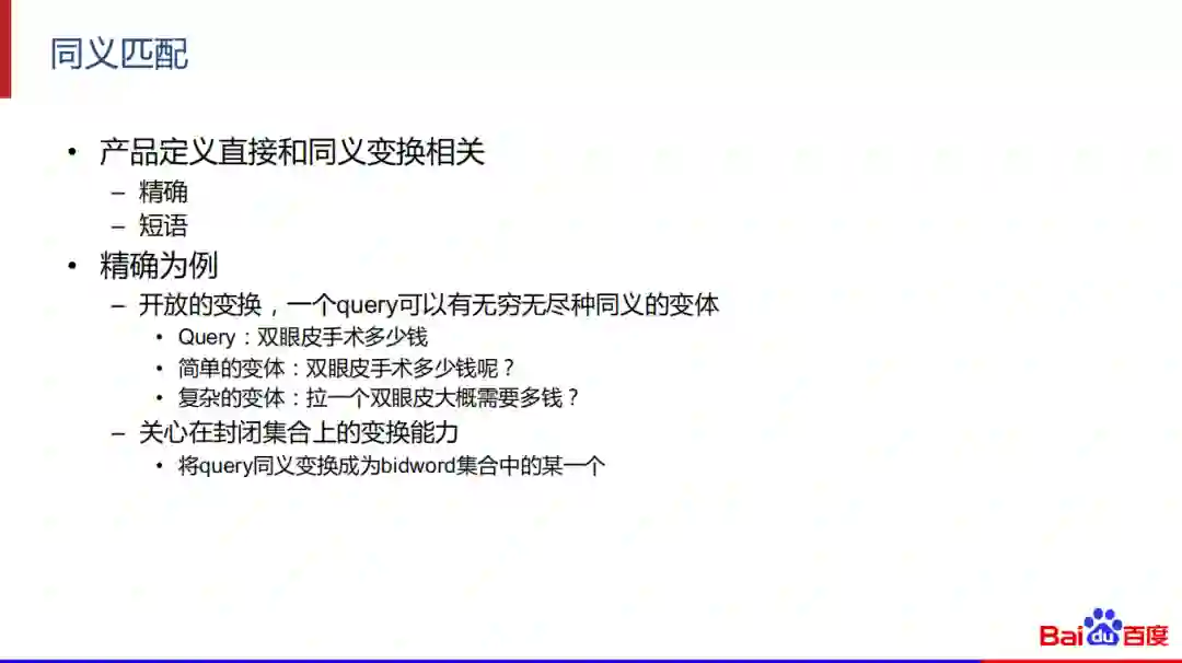 首先是产品定义的同义匹配问题,在刚刚提到的三个匹配模式中精确匹配和短语匹配与其是直接相关的。一般情况下,一个query可以有无数个同义变体。例如一个query是“双眼皮手术多少钱”,简单的变体是“双眼皮手术多少钱呢?”,一个更为复杂的变体是“拉一个双眼皮大概需要多钱?”。如果在一个开放域中变换的话,一个query可能有无穷无尽种同义的变体,而我们主要关心的是在封闭集合上的变换能力,即将query同义变换为bidword集合中的某一个。